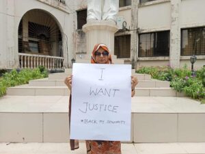 কুমিল্লা বিশ্ববিদ্যালয়ে “আই ওয়ান্ট জাস্টিস, ব্যাক মাই সিনিওরিটি” লেখা সম্বলিত প্ল্যাকার্ড হাতে অবস্থান কর্মসূচি পালন করেছে কুমিল্লা বিশ্ববিদ্যালয়ের ব্যবস্থাপনা শিক্ষা বিভাগের সহকারী অধ্যাপক মোসাঃ শাহিনুর বেগম।